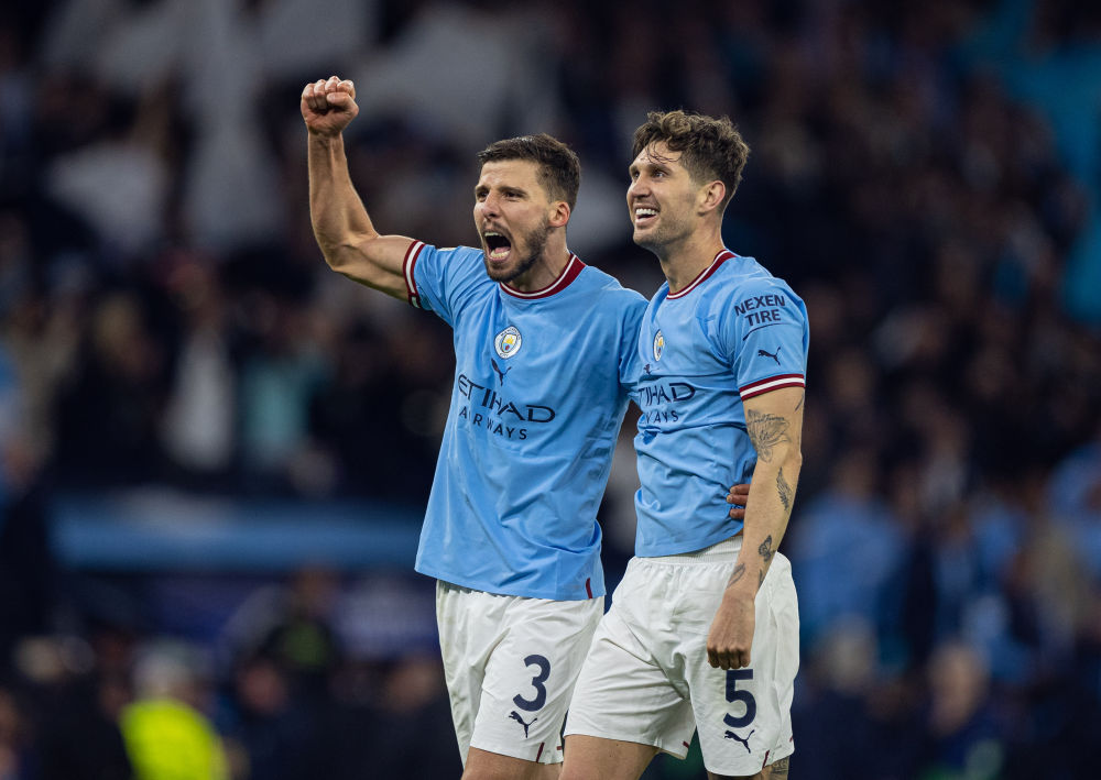 5月17日,曼城队球员迪亚斯(左)与斯通斯在比赛后庆祝胜利。新华社发